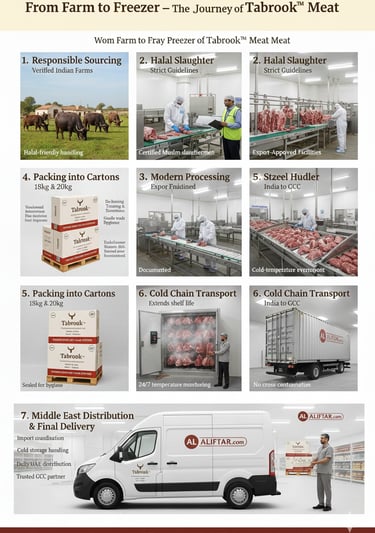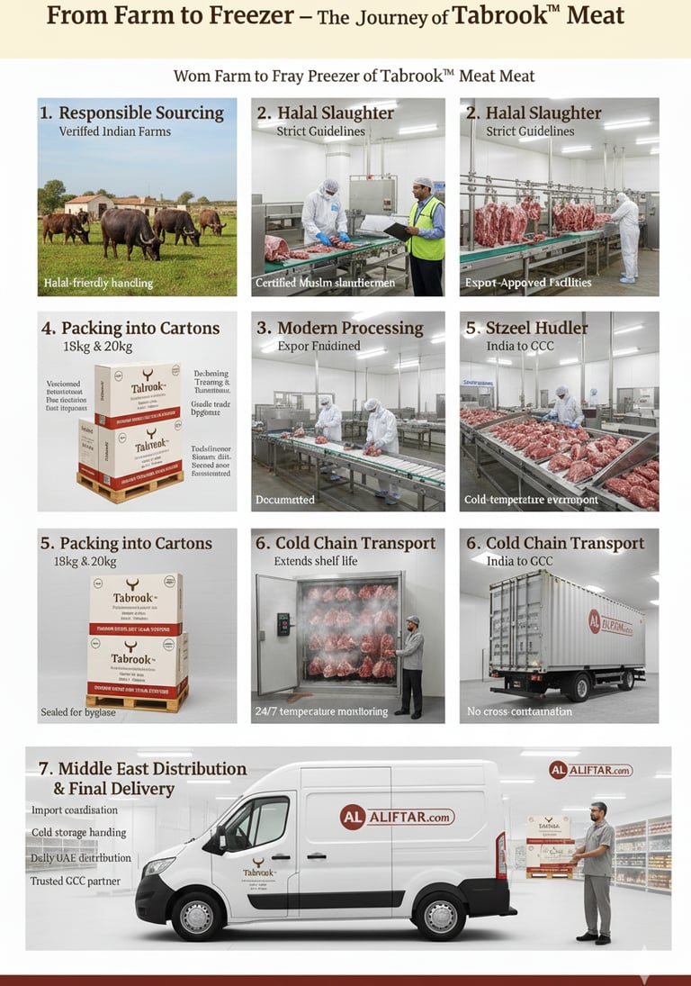 When a buyer receives a Tabrook™ box — whether it’s Indian buffalo meat, beef cuts, veal leg, topside, knuckle, or cubes — they’re not just receiving a product. They’re receiving a carefully controlled, fully documented, Halal-certified journey that begins at the farm and ends in the buyer’s cold storage.